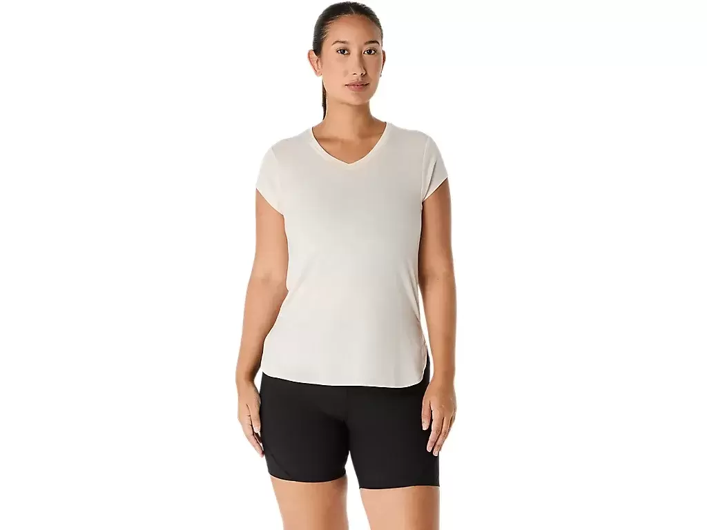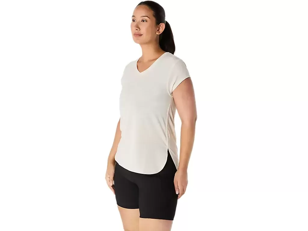 Ta bluzka z krótkim rękawem i dekoltem w serek została zaprojektowana tak, aby zapewnić uczucie gładkości i komfortu. Wykonana jest z wygodnej dzianiny, a jej boczne szwy z przodu zapewniają swobodę ruchów.