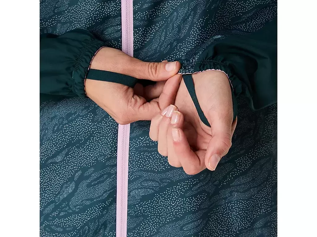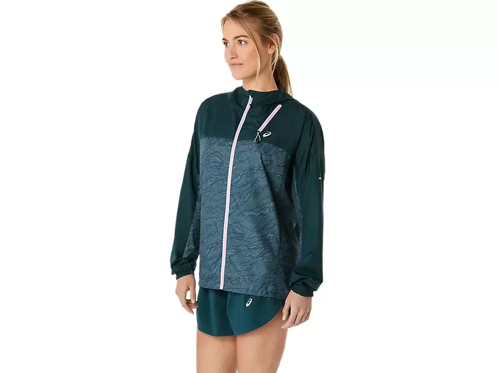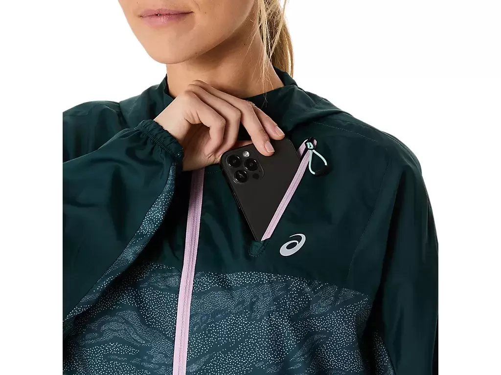 Kurtkę zdobi nadruk na całej powierzchni. Można ją łatwo zdjąć i spakować do kieszeni na piersi podczas biegu.