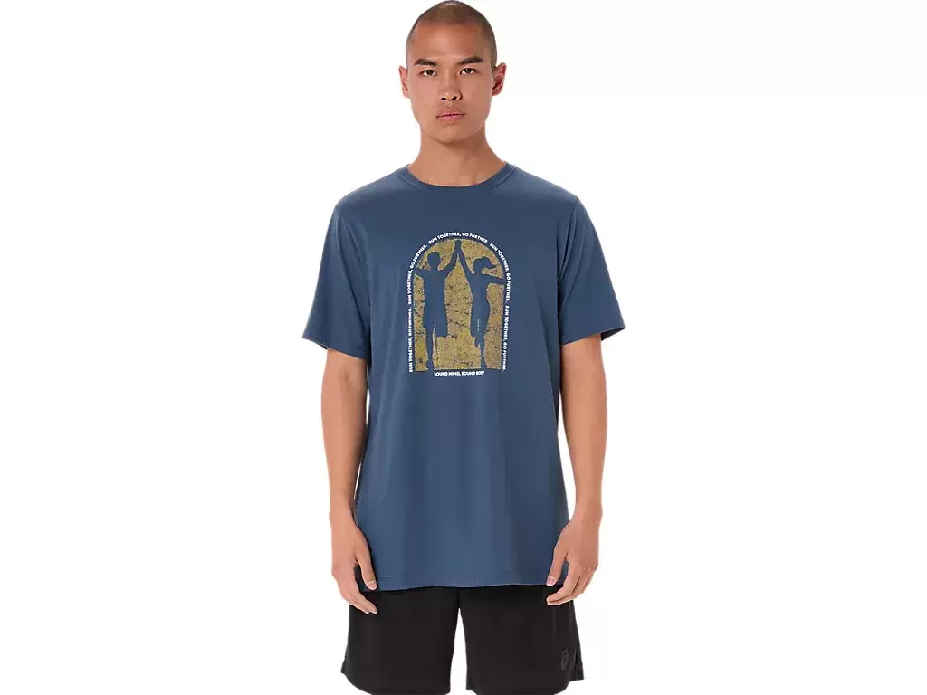 Ta wygodna dzianinowa koszulka z krótkim rękawem podkreśla wagę zdrowia psychicznego na świecie. Grafika z przodu przedstawia dwóch biegaczy trzymających się za ręce, a centralna część wzoru obiega napis „BIEGNIJ RAZEM, DALEJ”.