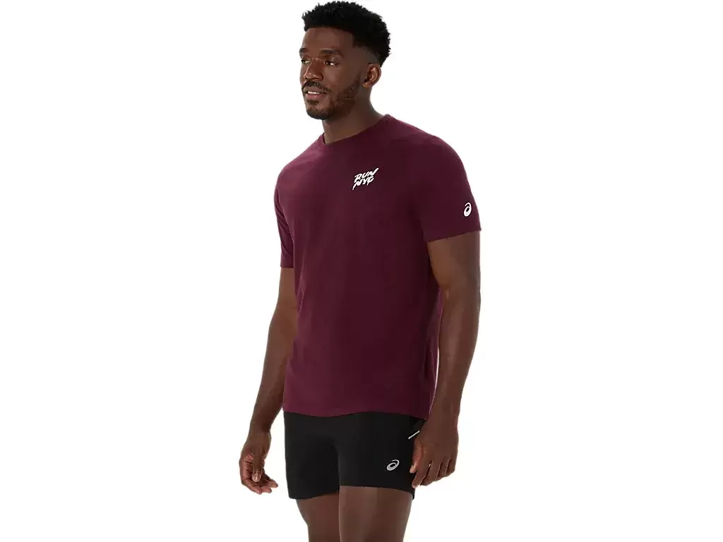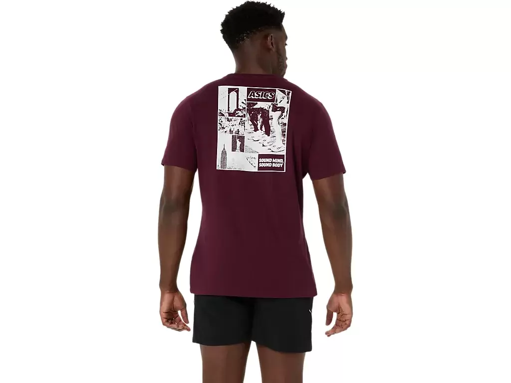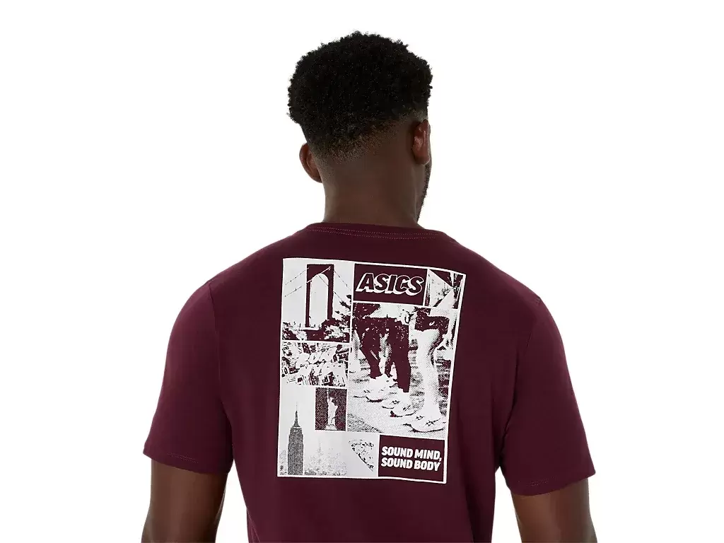 Ta wygodna dzianinowa koszulka z krótkim rękawem czerpie inspirację z biegania w Nowym Jorku. Przód zdobi napis „RUN NYC”, który z tyłu uzupełniają liczne nowojorskie zabytki.