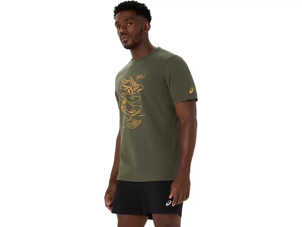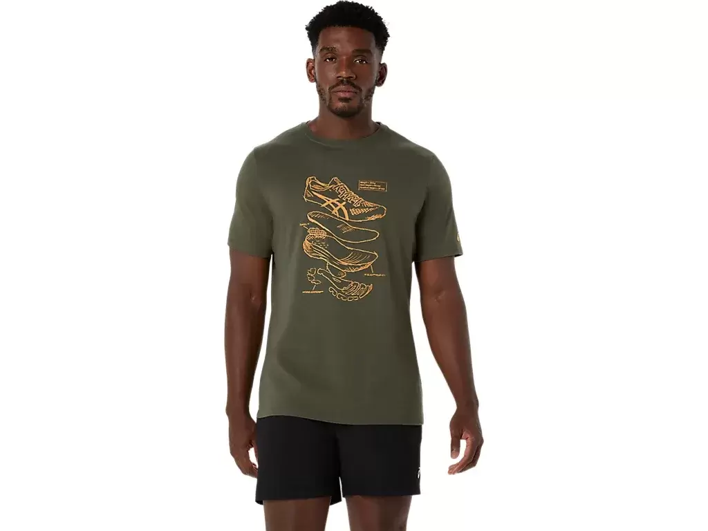 Ta wygodna dzianinowa koszulka z krótkim rękawem inspirowana jest szkicami butów do biegania ASICS. Z przodu znajduje się nadruk przedstawiający różne komponenty używane do produkcji naszych butów do biegania.